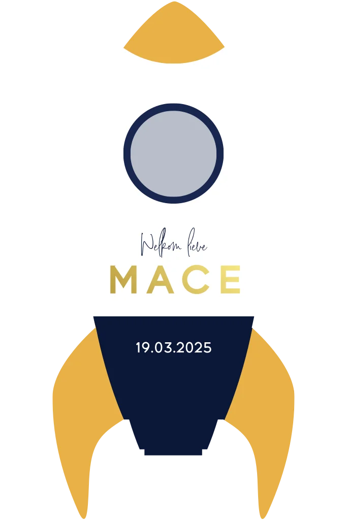 Kondig de geboorte van jullie zoontje aan met dit unieke kaartje. Het kaartje heeft de vorm van een raket. De combinatie van gele en blauwe elementen is prachtig en de goudfolie naam maakt dit kaartje helemaal af. Pas het kaartje naar wens aan in onze online editor en bestel snel een proefdruk om dit kaartje in het echt te zien!