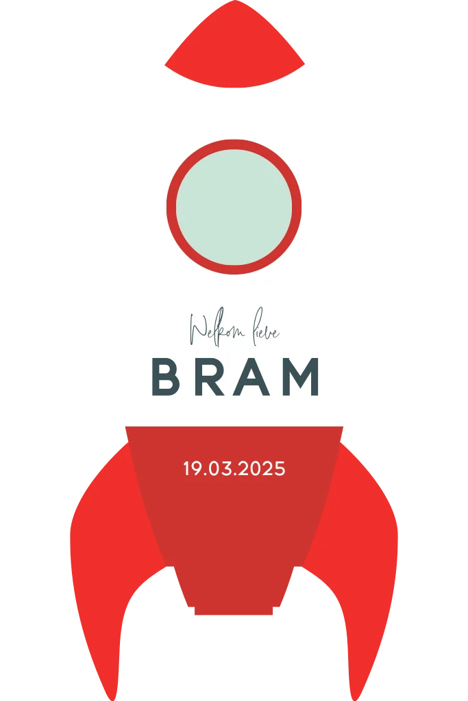 Dit is een origineel kaartje om de geboorte van jullie kindje aan te kondigen. Het kaartje heeft de vorm van een raket. De rode accenten geven dit kaartje een extra stoere uitstraling. Pas het kaartje naar wens aan in onze online editor en bestel snel een proefdruk om dit kaartje in het echt te zien!