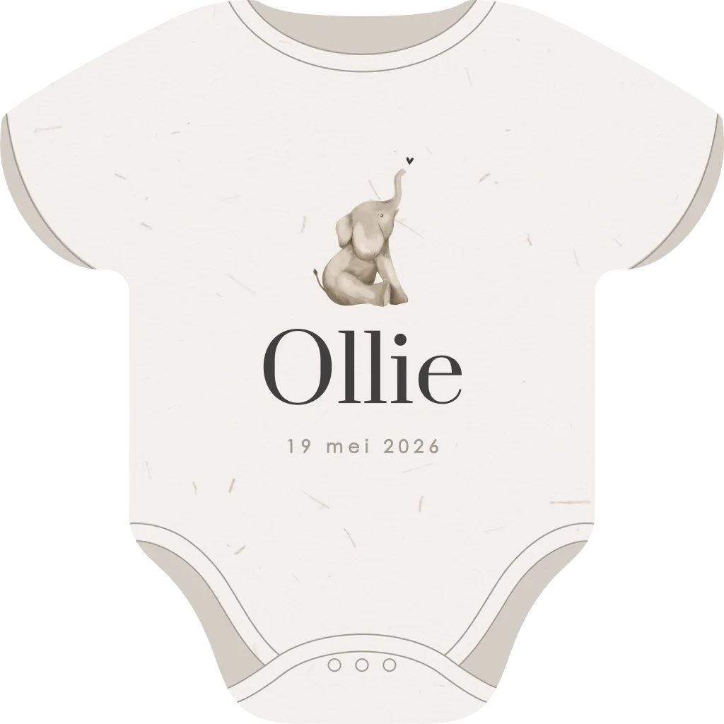 Uniek geboortekaartje met olifant in de vorm van een romper