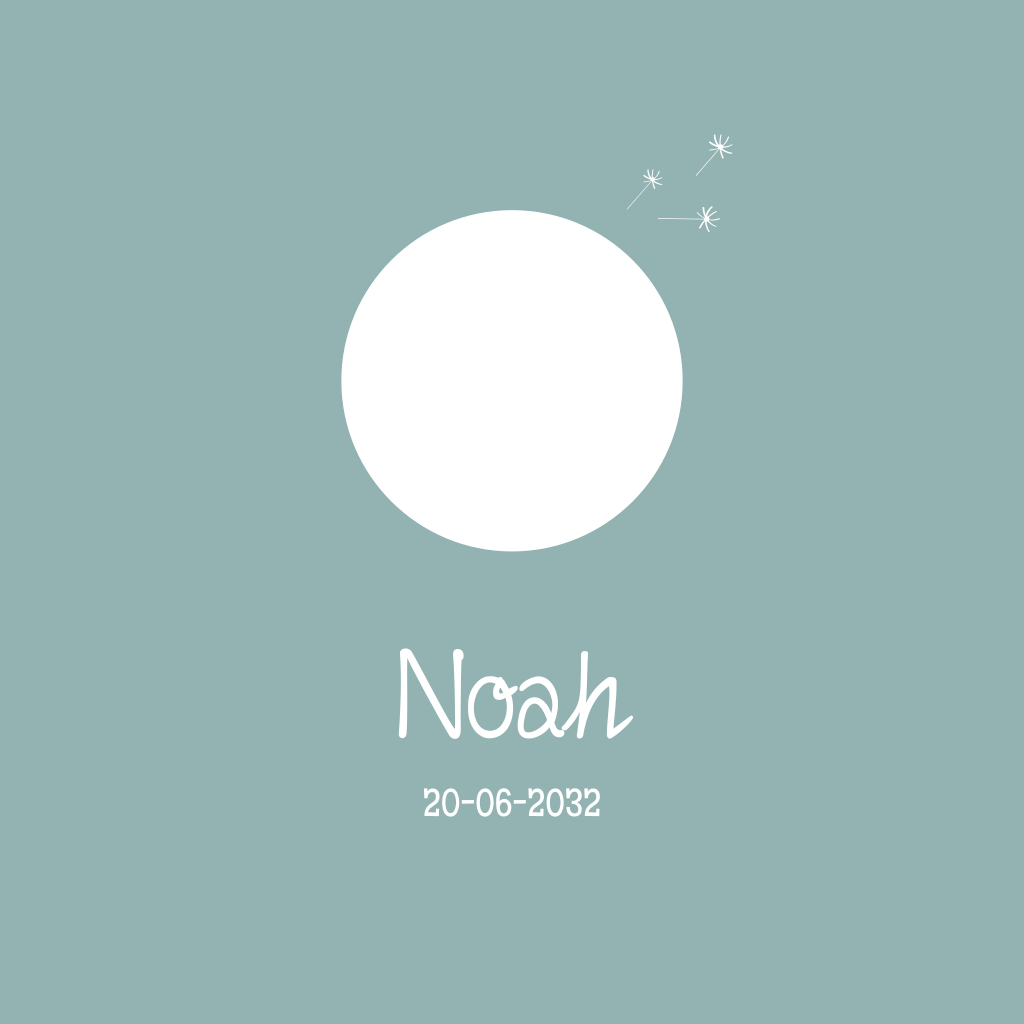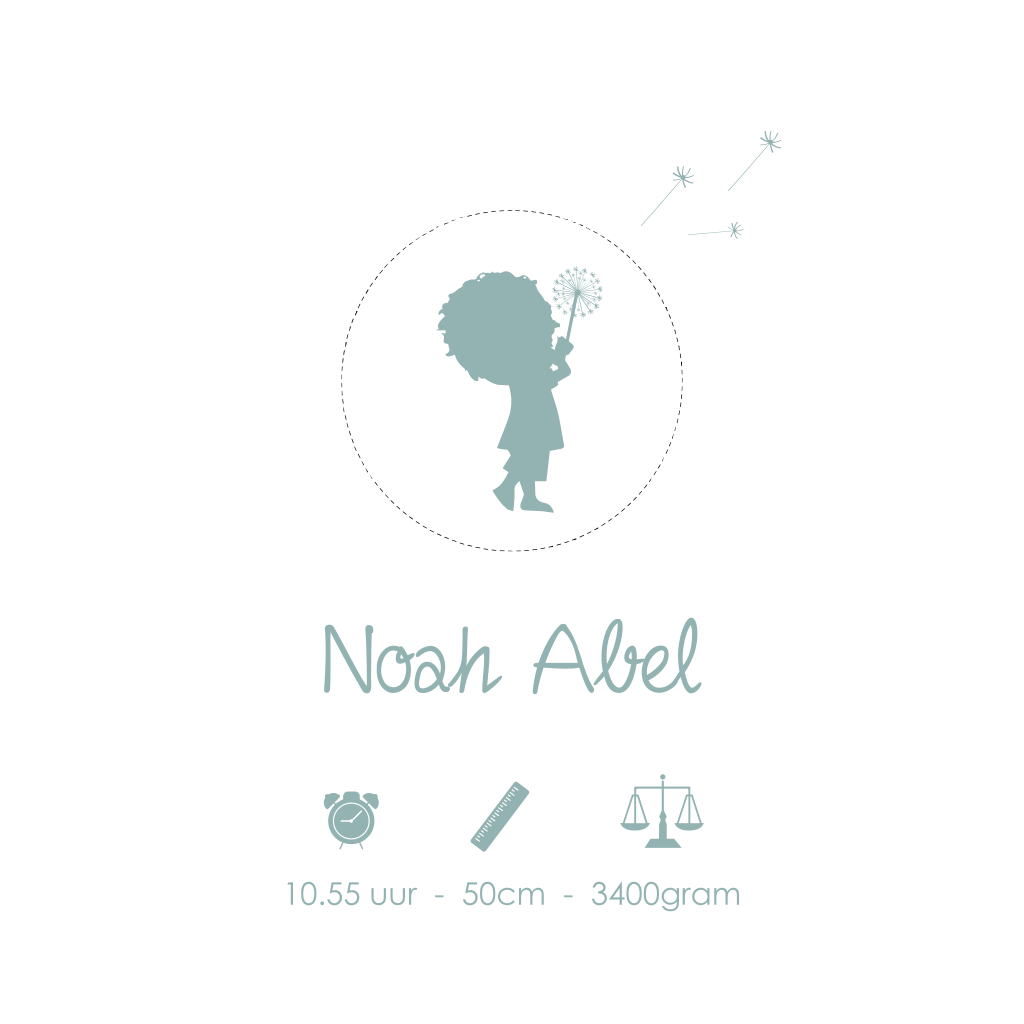 Dit is een lief geboortekaartje voor jullie zoon. Het kaartje heeft een mooie blauwe achtergrond. De uitsnede van de cirkel geeft een doorkijkje naar de binnenkant van de kaart waar het silhouet van een jongen te zien. Het jongetje heeft een paardenbloem vast. Pas het kaartje naar wens aan in onze online editor en bestel snel een proefdruk om dit kaartje in het echt te zien!