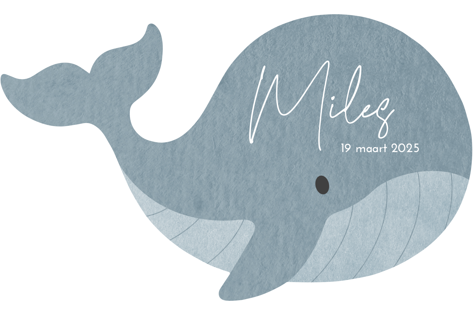 Dit is een bijzonder kaartje voor jullie pasgeboren zoontje. Het kaartje heeft de vorm van een walvis. De achtergrond heeft een blauwgrijze kleur waardoor de witte typografie goed opvalt. Pas het kaartje naar wens aan in onze online editor en bestel snel een proefdruk om dit kaartje in het echt te zien!