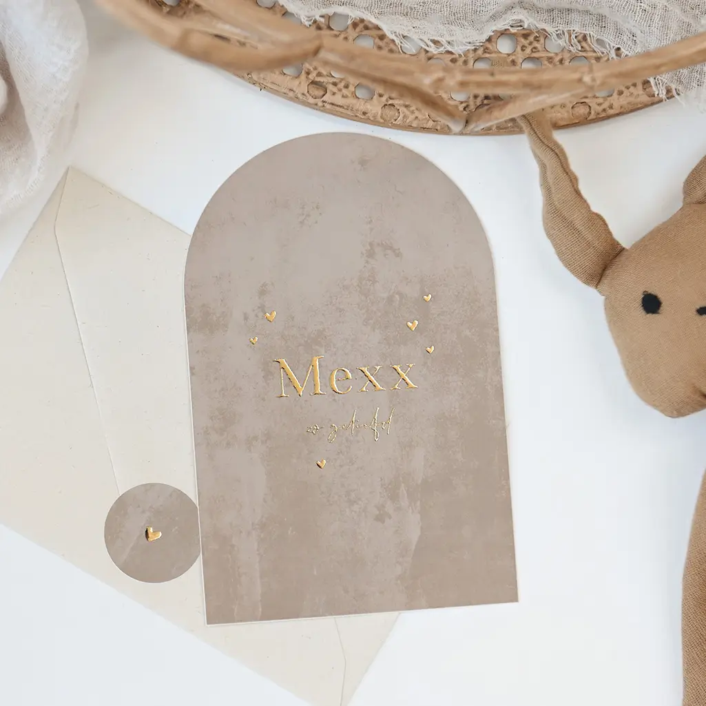 Kondig de geboorte van jullie zoon of dochter aan met dit originele kaartje. Het kaartje heeft een velvet-look achtergrond. De kleine goudfolie hartjes maken dit kaartje helemaal af. Benieuwd naar dit kaartje? Bestel een proefdruk en bekijk dit kaartje in het echt!