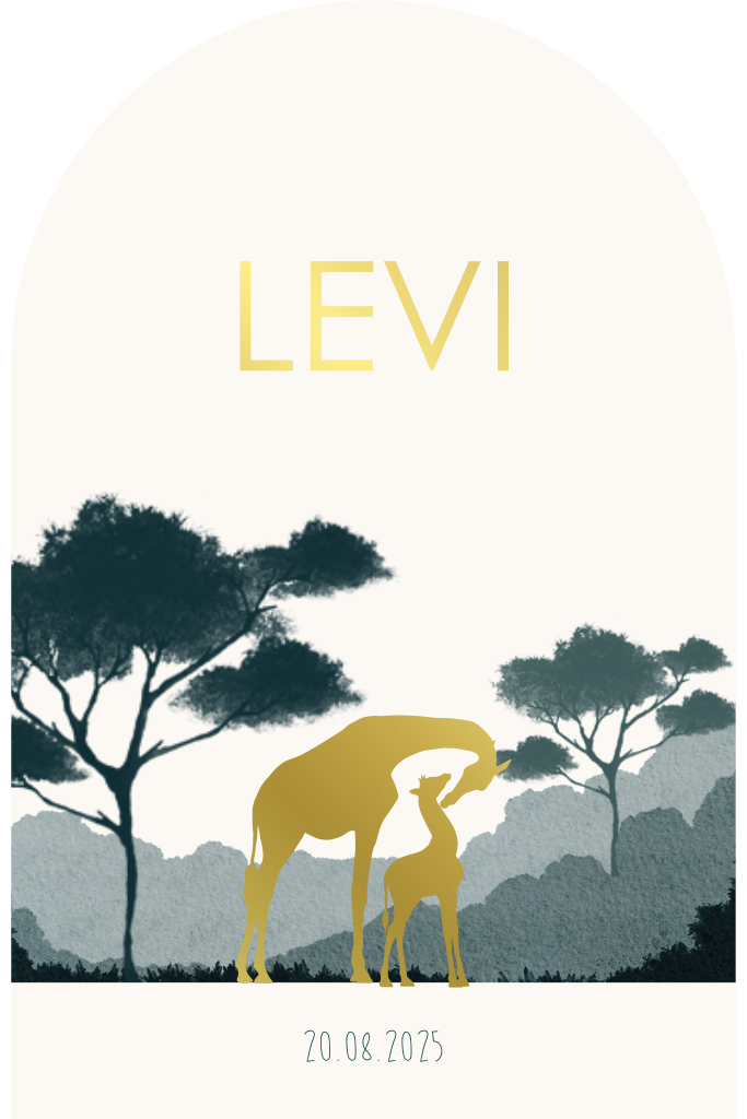 Een origineel geboortekaartje met een moeder giraffe en een baby giraffe. De twee dieren staan in een landschap vol bergen en bomen. Het kaartje heeft blauwe en petrol kleuren. De naam en de illustratie van de giraffes zijn in goudfolie gedrukt. Pas dit kaartje volledig naar wens aan in onze online editor.