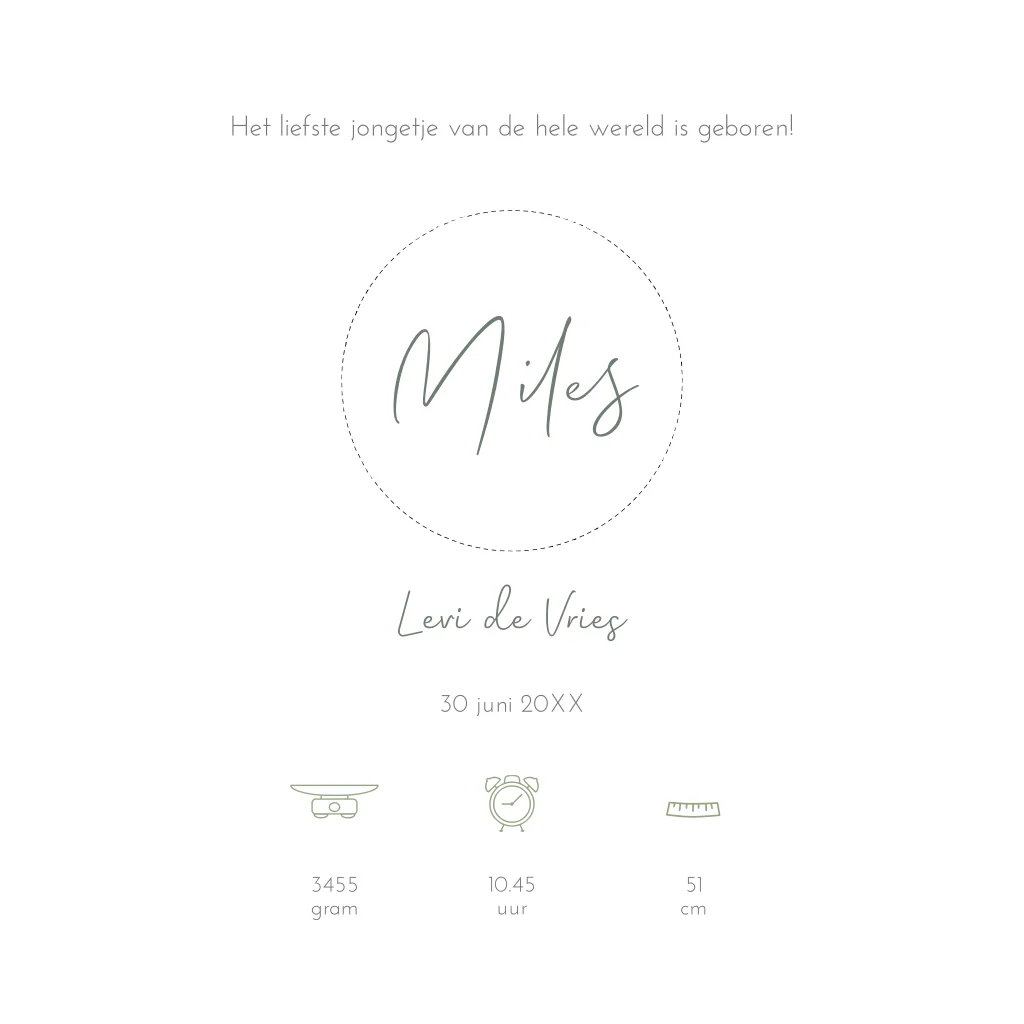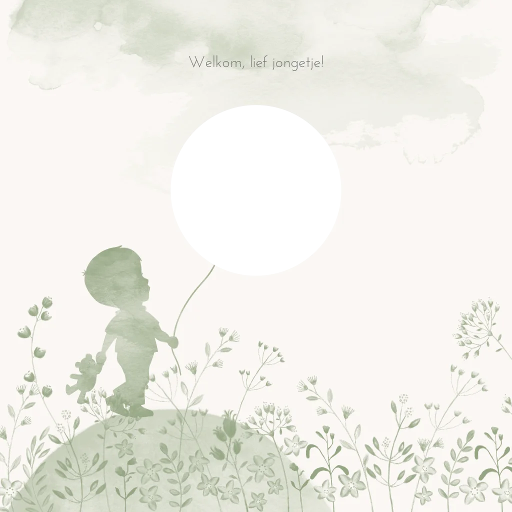 Dit unieke geboortekaartje heeft een groene watercolour achtergrond. Op de voorkant staat het silhouet van een jongen met een ballon in zijn hand. De ballon geeft een doorkijkje naar de binnenkant van de kaart waar de naam van jullie kleintje staat. Pas het kaartje naar wens aan in onze online editor en bestel snel een proefdruk om dit kaartje in het echt te zien!