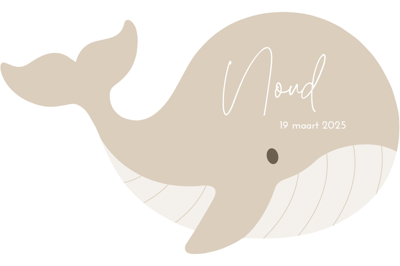 Een uniek geboortekaartje voor jullie pasgeboren kindje. Het kaartje heeft de vorm van een walvis. De achtergrond heeft een beige kleur waardoor de witte typografie goed opvalt. Pas het kaartje naar wens aan in onze online editor en bestel snel een proefdruk om dit kaartje in het echt te zien!