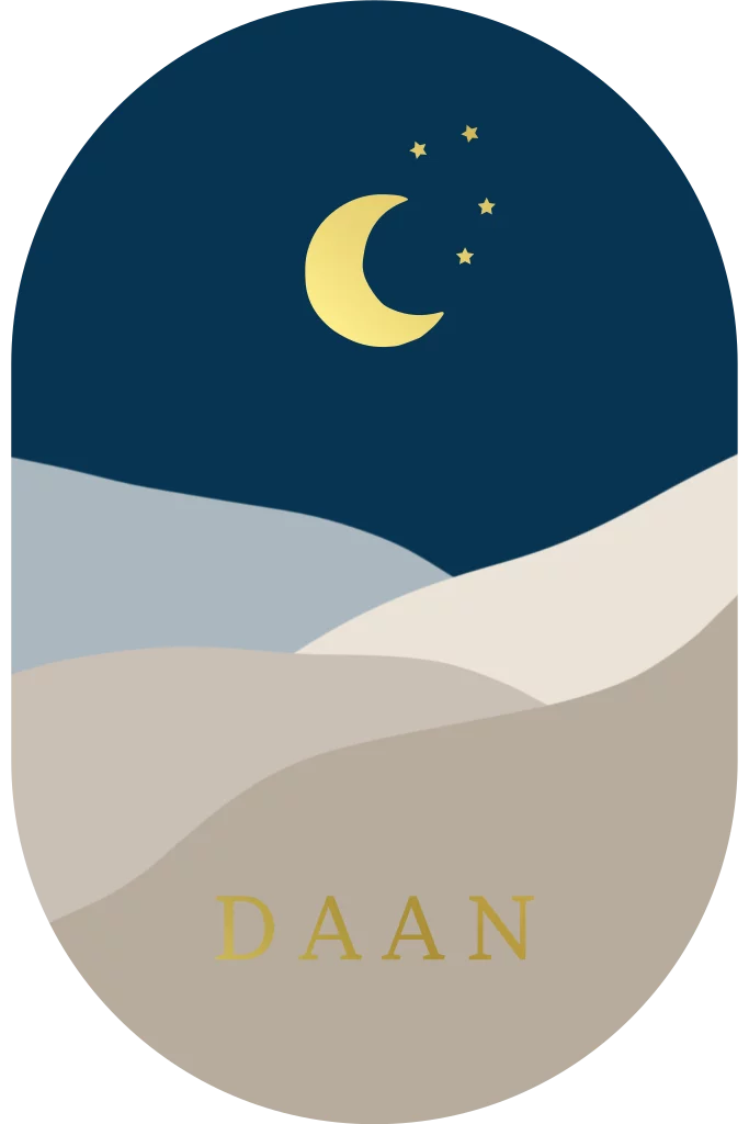 Een stijlvol origineel geboortekaartje voor jouw kindje! Het kaartje heeft een ovale vorm met donkerblauwe achtergrond. Je ziet een berglandschap met maantje en sterretjes. Onderaan het kaartje lees je de naam van het kindje.