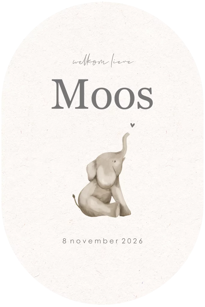 Een lief geboortekaartje voor jouw kindje. Het kaartje heeft een ovale vorm met daarop een illustratie van een olifant. Pas het ontwerp naar wens zelf aan.