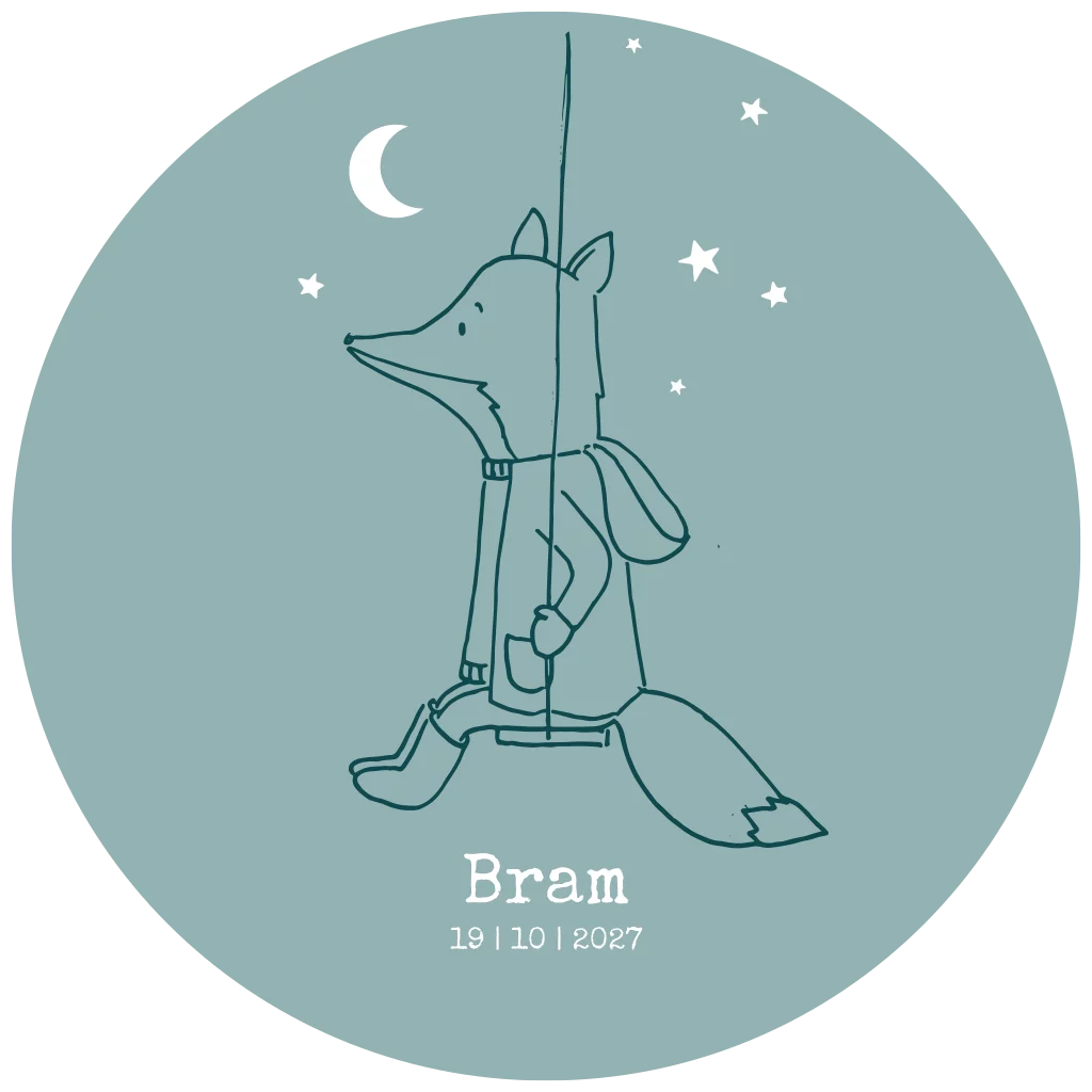 Een lief geboortekaartje voor jullie toekomstige zoon. Dit ronde unieke kaartje heeft een lieve lijntekening van een vosje op een schommel onder een sterrenhemel. De achtergrond van het kaartje heeft een blauw grijze kleur. Pas het kaartje naar wens aan in onze online editor.