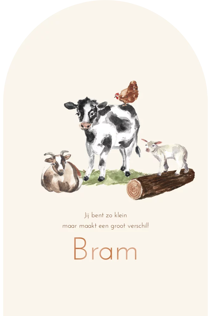 Dit is een uniek kaartje voor jullie zoontje. Het kaartje heeft de vorm van een arch. Op het kaartje zijn verschillende boerderij dieren geïllustreerd. De naam wordt gedrukt in hoogglans. Pas het kaartje naar wens aan in onze online editor en bestel snel een proefdruk om dit kaartje in het echt te zien!