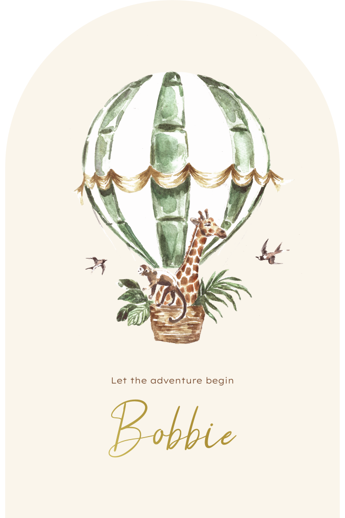 Kondig de geboorte van jullie zoon aan met dit kaartje in de vorm van een arch. Op het kaartje staat de illustratie van een luchtballon. In het mandje zijn een giraffe en aap te zien met twee vogeltjes. De naam van jullie kleintje wordt gedrukt in goudfolie. Pas het kaartje naar wens aan in onze online editor en bestel snel een proefdruk om dit kaartje in het echt te zien!Dit product maakt onderdeel uit van deze set.