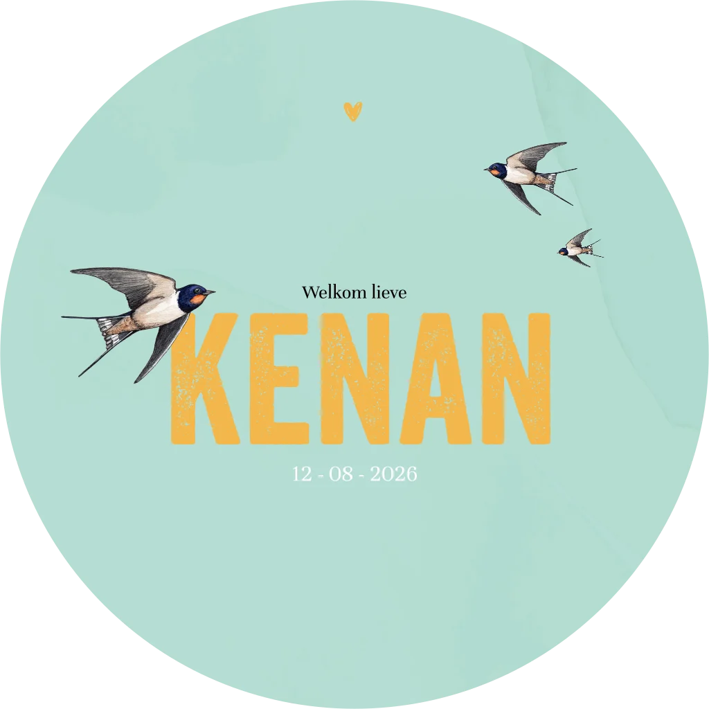 Rond geboortekaartje met groene watercolour en zwaluwen