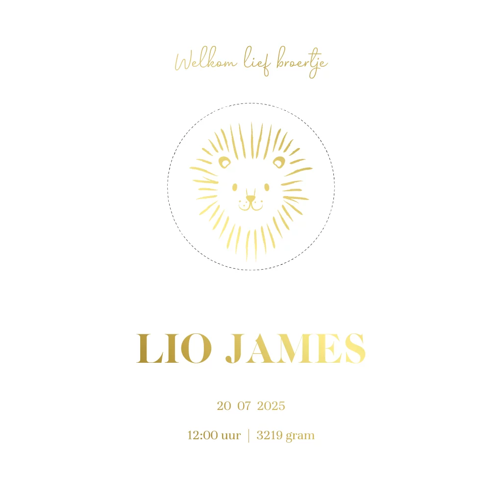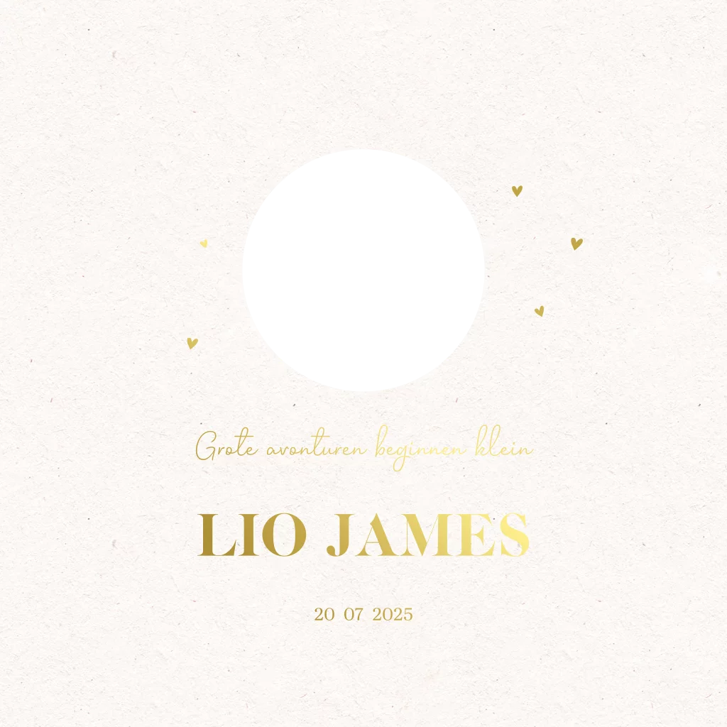 Een prachtig geboortekaartje voor de geboorte van jullie kleintje. Dit kaartje heeft een uitgesneden vorm van een rondje wat een leuk doorkijkje maakt naar een schattig leeuwtje. Het leeuwtje en de naam van jullie kindje staat in goudfolie gedrukt wat het kaartje een luxe uitstraling geeft. Bepaal je eigen tekst, voeg zelf afbeeldingen toe en maak dit kaartje extra persoonlijk!