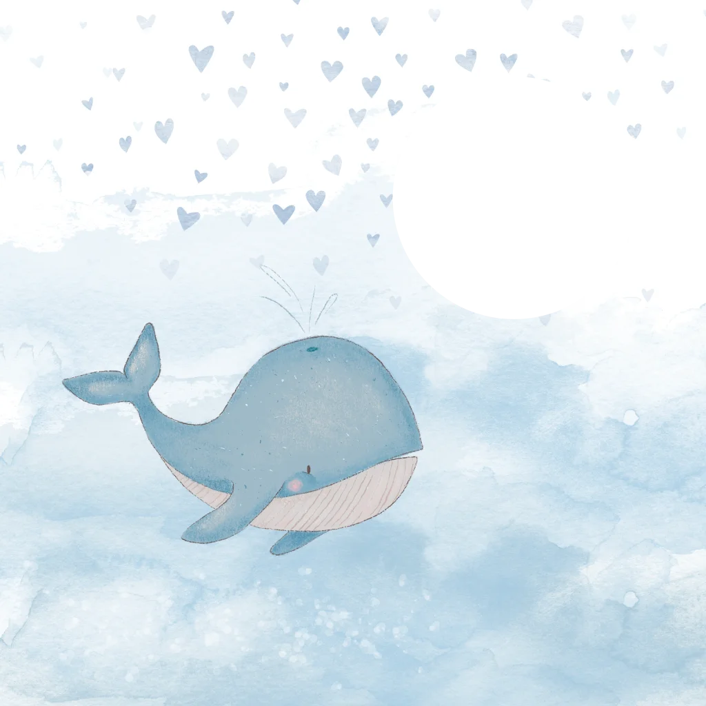 Lief geboortekaartje met watercolour, walvis, hartjes en doorkijkje