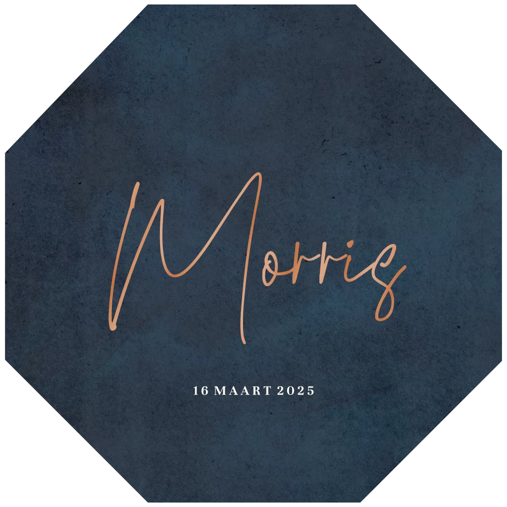 Kondig de geboorte van jullie zoontje aan met dit bijzondere kaartje! Het kaartje heeft de vorm van een hexagon. De donkerblauwe velvet-look staat prachtig in combinatie met de hoogglans naam. Pas het kaartje naar wens aan in onze online editor en bestel snel een proefdruk om dit kaartje in het echt te zien!