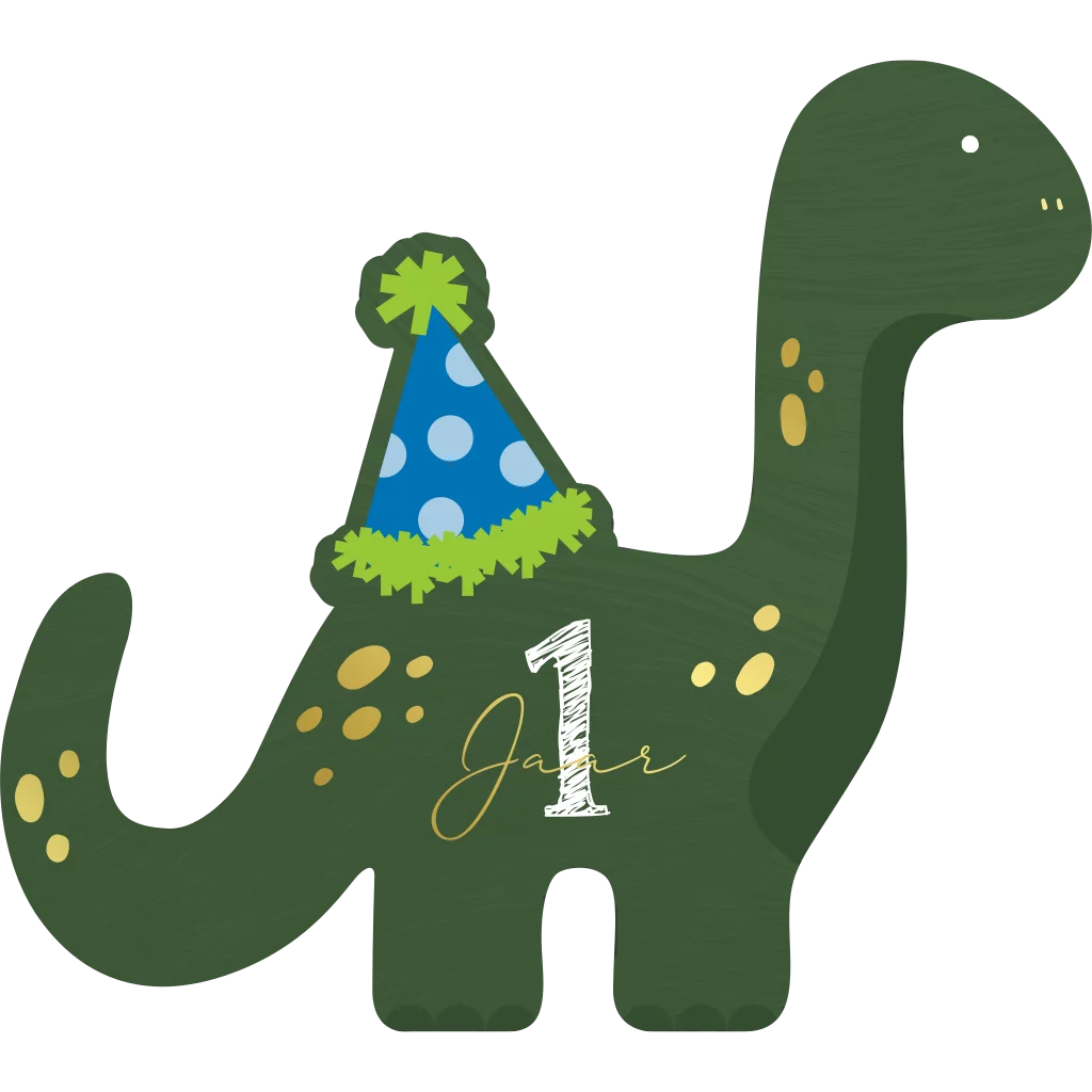 Hoera, jullie zoontje is jarig! Nodig vrienden en familie uit met deze feestelijke kaart. De kaart heeft de vorm van een dino. De achtergrond is donkergroen en staat mooi in combinatie met de goudfolie details. Het feestmutsje maakt dit kaartje helemaal af!
