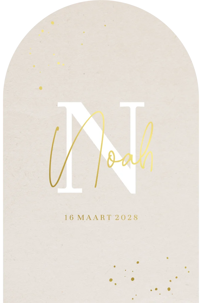 Dit is een stijlvol geboortekaartje in boogvorm. Centraal op het kaartje staat een initiaal met daar doorheen de naam van jullie kleintje gedrukt in goudfolie. Ook de geboortedatum en spetters worden gedrukt in goudfolie. Pas het kaartje naar wens aan in onze online editor en bestel snel een proefdruk om dit kaartje in het echt te zien!