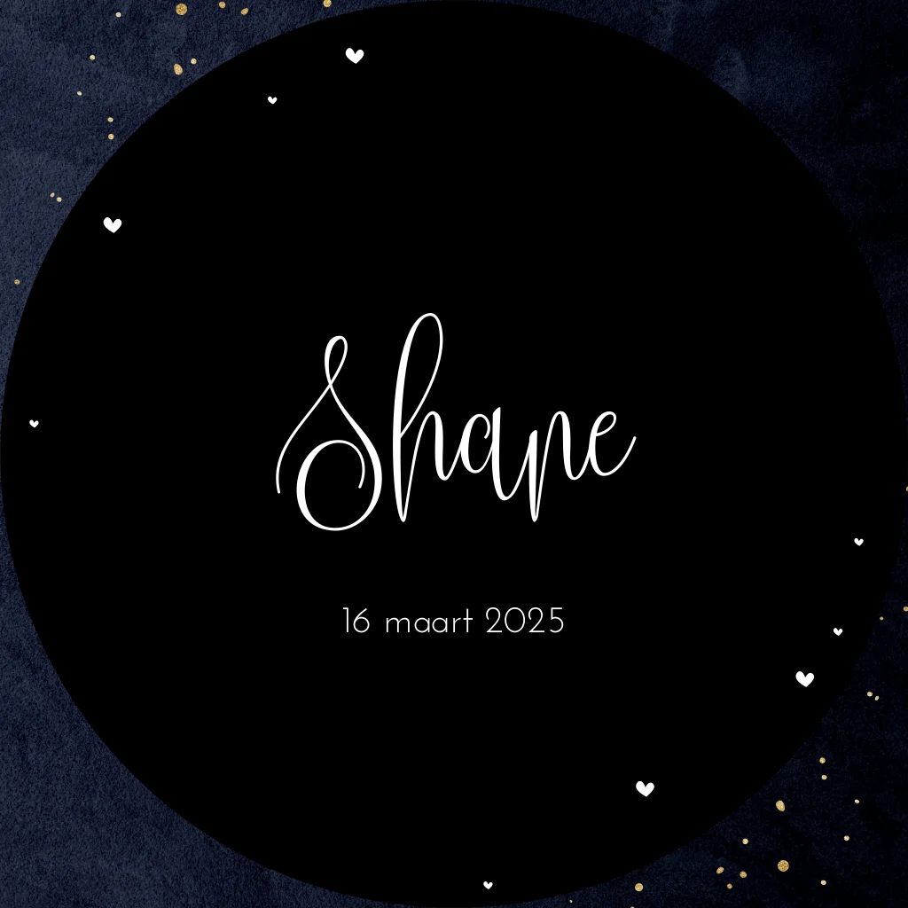 Kondig de geboorte van jullie zoontje aan met dit unieke kaartje! Het kaartje heeft de vorm van een cirkel. De donkerblauwe velvet-look achtergrond staat prachtig in combinatie met de goudfolie opdruk. Pas het kaartje naar wens aan in onze online editor en bestel snel een proefdruk om dit kaartje in het echt te zien!
