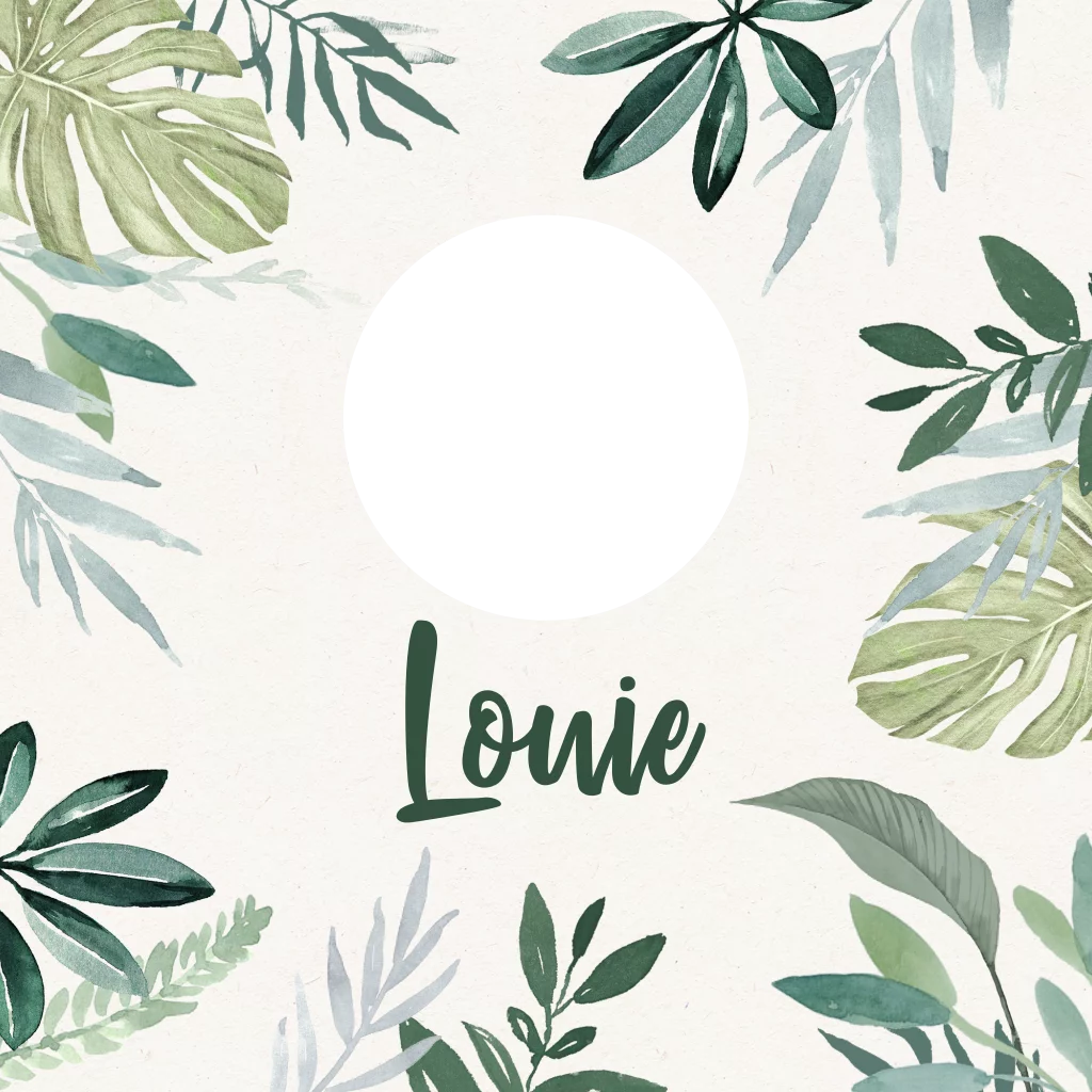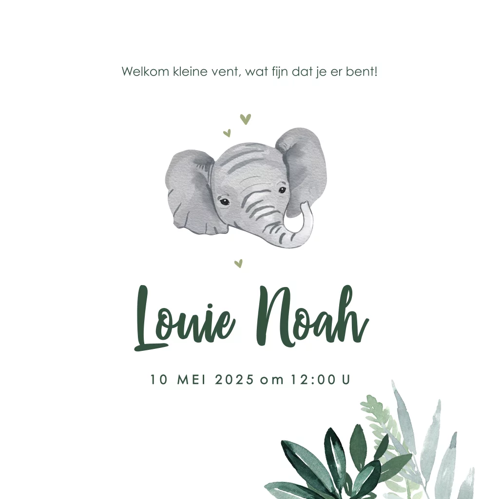 Dit is een stans kaartje met jungle thema voor de geboorte van jullie zoontje. Illustraties van junglebladeren staan rondom de cirkelvormige uitsnede met een doorkijkje naar het olifantje aan de binnenkant van de kaart. Het kaartje is naar wens aan te passen in onze online editor. Bestel snel een proefdruk om dit kaartje in het echt te zien!
