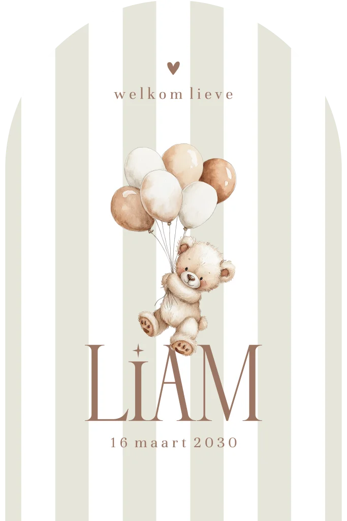 Schattig geboortekaartje in boogvorm met beertje en ballonnen. Personaliseer eenvoudig in onze editor.