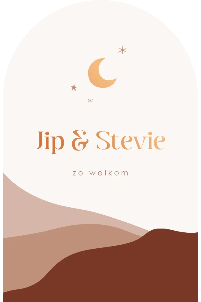Kondig de geboorte van jullie tweeling aan met dit kaartje in de vorm van een arch. Op het kaartje zie je een berglandschap in aardetinten. In de lucht zie je een maan gedrukt in koperfolie, net als de namen. Pas het kaartje naar wens aan in onze online editor en bestel snel een proefdruk om dit kaartje in het echt te zien!