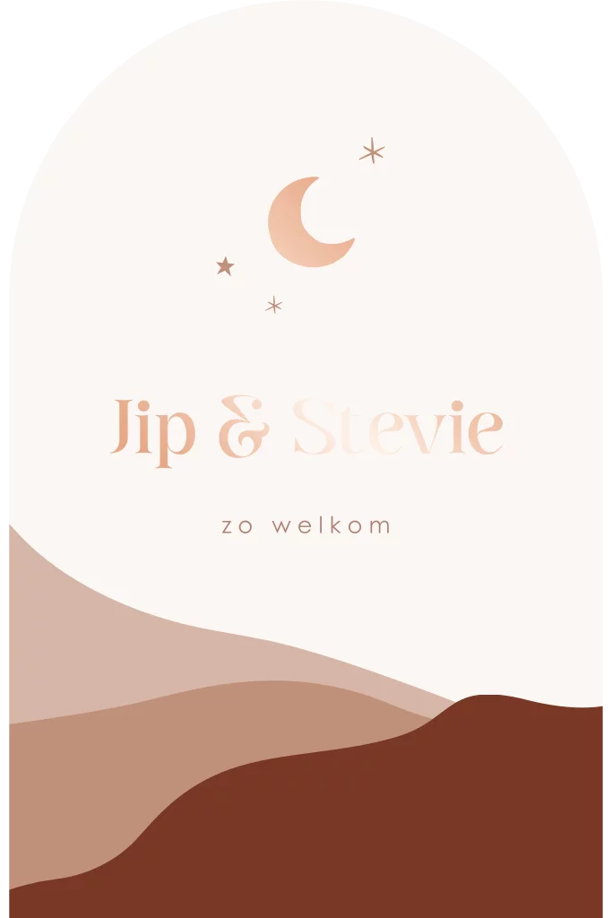 Kondig de geboorte van jullie tweeling aan met dit kaartje in de vorm van een arch. Op het kaartje zie je een berglandschap in aardetinten. In de lucht zie je een maan gedrukt in roségoudfolie, net als de namen. Pas het kaartje naar wens aan in onze online editor en bestel snel een proefdruk om dit kaartje in het echt te zien!