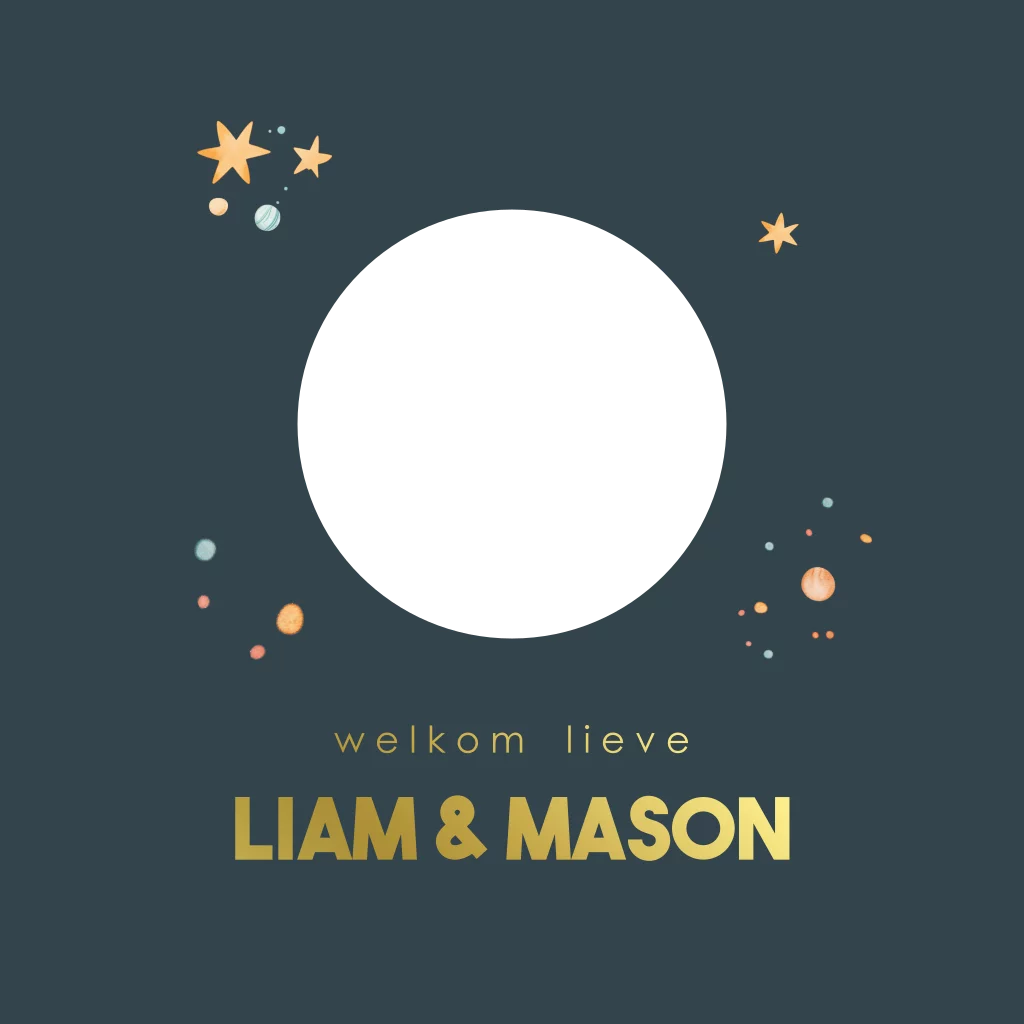 Een tof geboortekaartje voor jullie tweeling. Dit kaartje heeft een blauwe achtergrond met ruimte thema. Door het doorkijkje zie je een racket. De namen worden gedrukt in goudfolie. Pas het ontwerp naar wens aan in onze online editor.