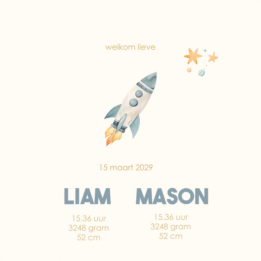 Tweeling geboortekaartje blauw met doorkijkje en ruimte thema