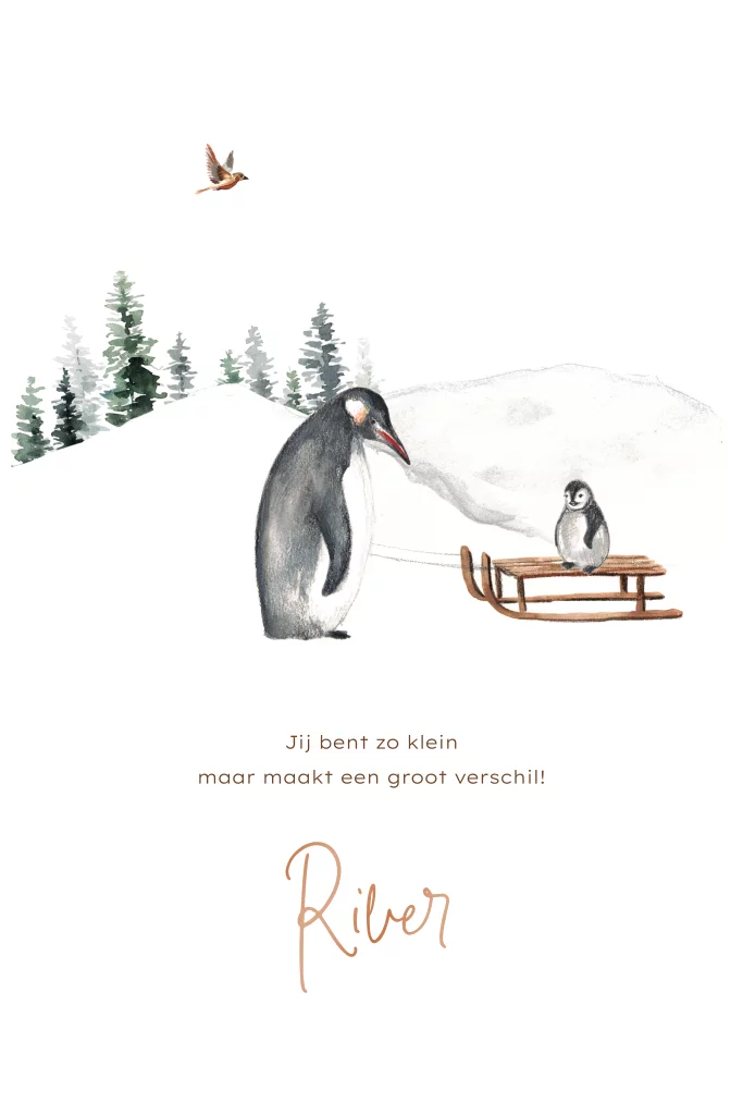 Dit is een prachtig geboortekaartje in originele vorm voor jullie zoon of dochter. In een winters landschap zijn twee pinguïns te zien. De naam wordt gedrukt in hoogglans en geeft dit kaartje een luxe effect. Pas het kaartje naar wens aan in onze online editor en bestel snel een proefdruk om dit kaartje in het echt te zien!