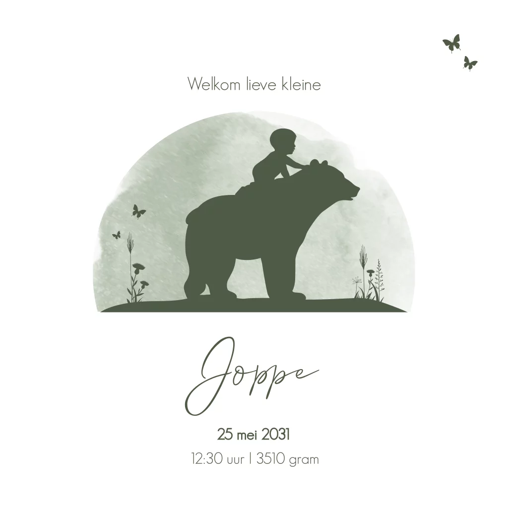 Groen watercolour geboortekaartje met silhouet van jongen op beer
