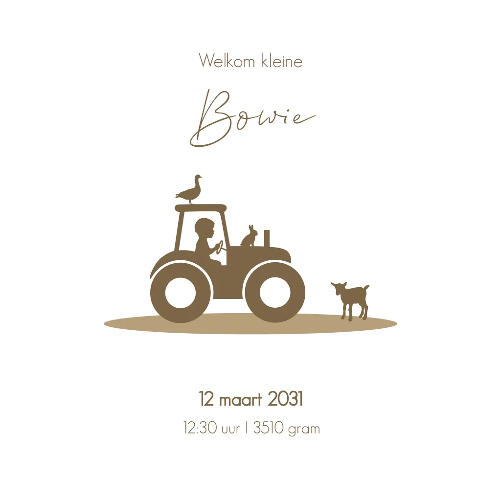 Kondig de geboorte van je zoon aan met dit stoere kaartje! Het kaartje heeft een watercolour achtergrond met een doorkijkje. Op de binnenkant van de kaart zie je het silhouetje van een jongen op een tractor. Het kaartje kan helemaal naar wens aangepast worden in onze online editor.
