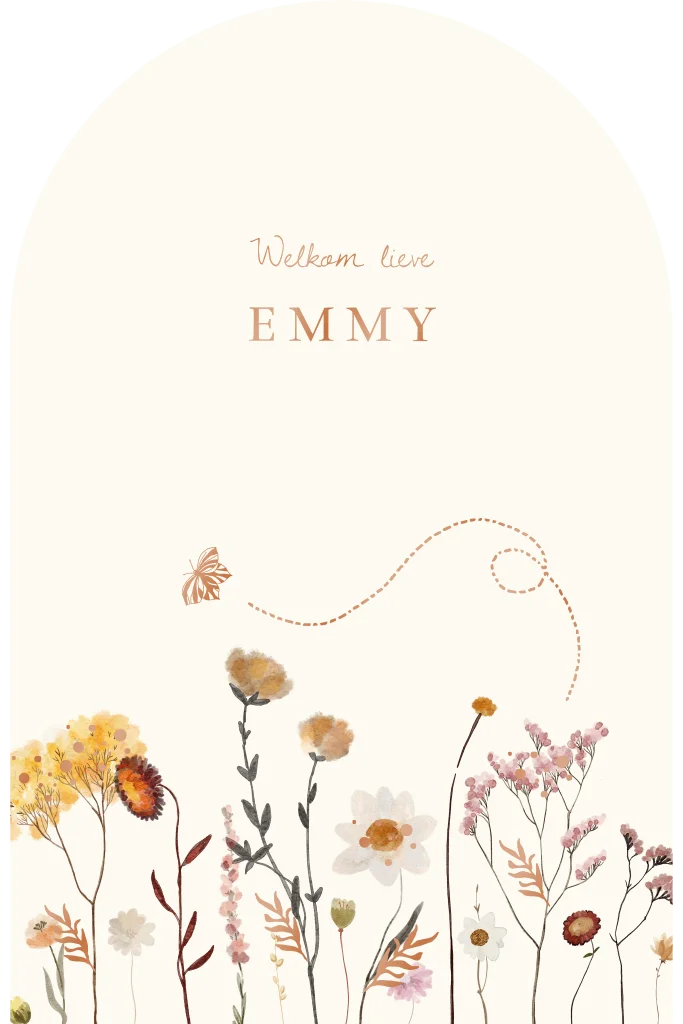 Een schattig arch geboortekaartje voor jouw meisje. Het kaartje heeft een unieke boog vorm. Op het kaartje zie je prachtige veldbloemen met daarboven een hoogglans vlinder. De naam is ook gedrukt in hoogglans. Pas het kaartje naar wens aan in onze online editor.