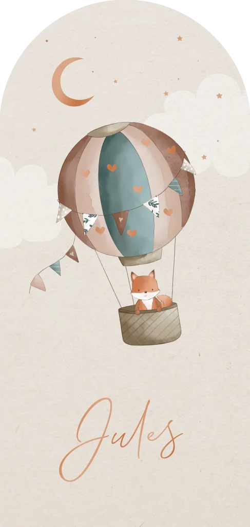 Wat een lief geboortekaartje! Dit kaartje heeft een arch vorm. Het ontwerp heeft een beige achtergrond met een illustratie van een vosje in een luchtballon. Daarnaast zie je verschillende hoogglans details. Pas het ontwerp naar wens zelf aan.