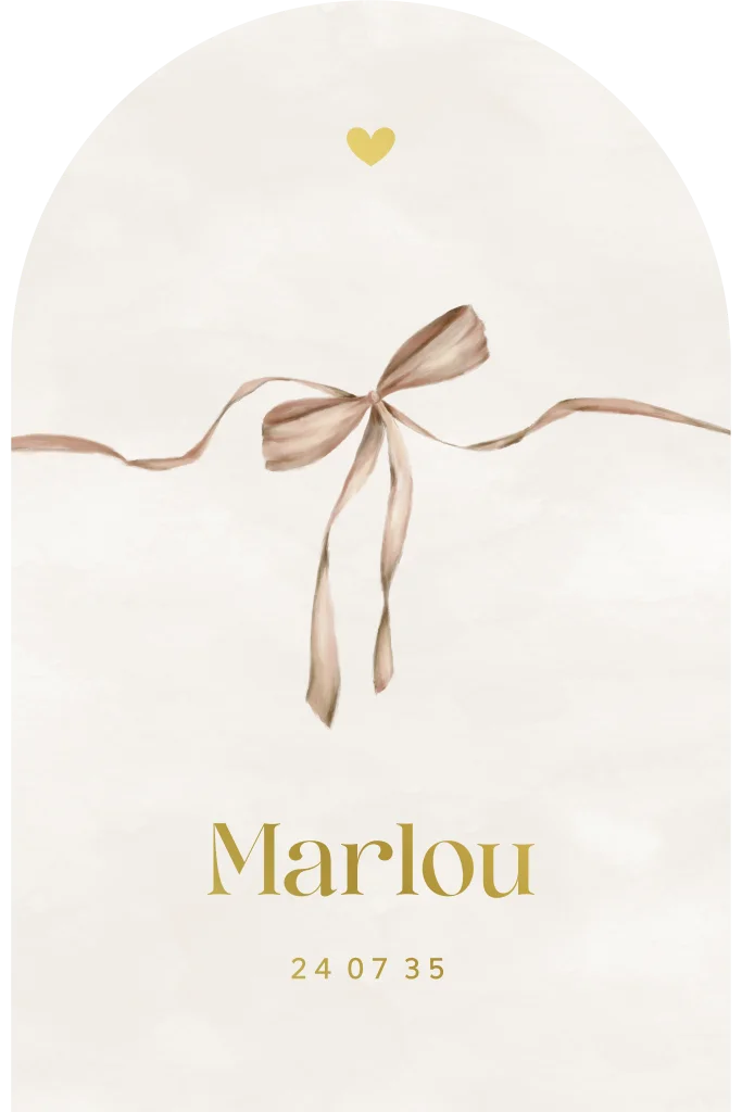 Dit is een origineel unisex kaartje voor de geboorte van jullie zoon of dochter. De kaart heeft de vorm van een arch en heeft een mooie illustratie van een strikje. De zachte tinten in combinatie met de aquarel structuur op de achtergrond is prachtig. Pas het kaartje naar wens aan in onze online editor en bestel snel een proefdruk om dit kaartje in het echt te zien!