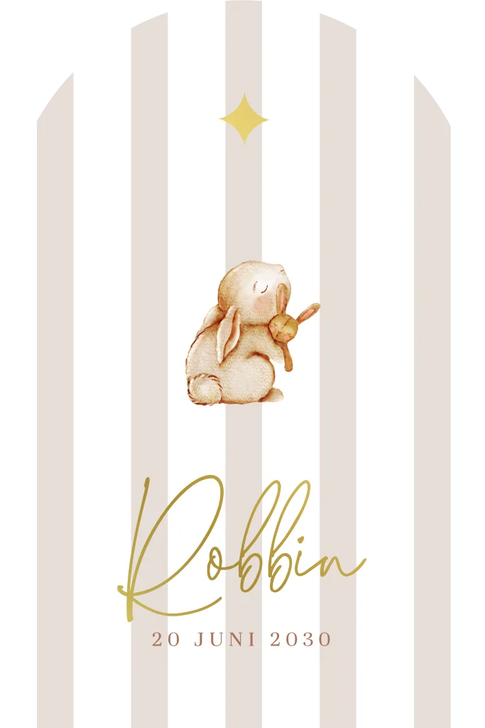 Elegant archvormig geboortekaartje met een minimalistische en luxe uitstraling. Op de voorkant staat een schattig konijntje dat een klein knuffelkonijntje vasthoudt, omringd door glinsterende gouden details. De zachte beige strepen op de achtergrond geven het kaartje een warme, tijdloze sfeer en versterken de stijlvolle uitstraling.