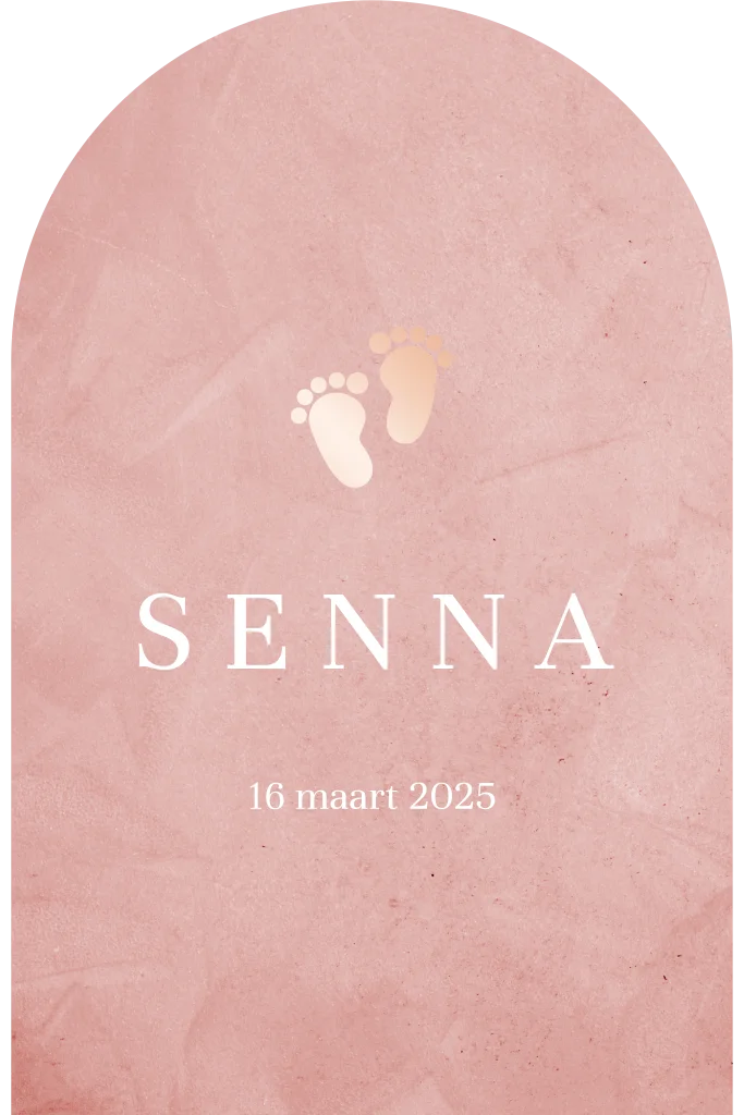 Kondig de geboorte van jullie dochter aan met dit luxe kaartje. Het kaartje heeft de vorm van een arch met een roze achtergrond. Boven de naam van jullie kleintje staan voetafdrukjes in roségoudfolie. Aan de binnenkant is ruimte voor een bijbeltekst of gedichtje om het kaartje extra persoonlijk te maken.