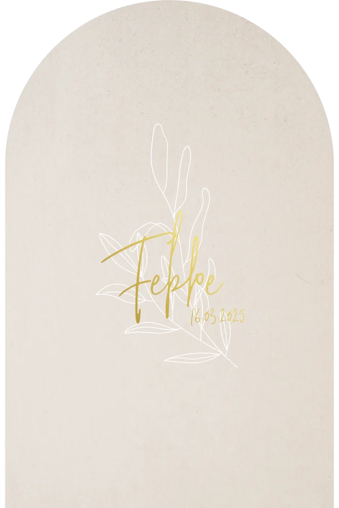 Dit is een luxe kaartje voor de geboorte van jullie pasgeboren kindje. Het kaartje heeft de vorm van een arch. Centraal op het kaartje staat de witte lijntekening van een takje. De goudfolie opdruk maakt dit kaartje helemaal compleet. Pas het kaartje naar wens aan in onze online editor en bestel snel een proefdruk om dit kaartje in het echt te zien!