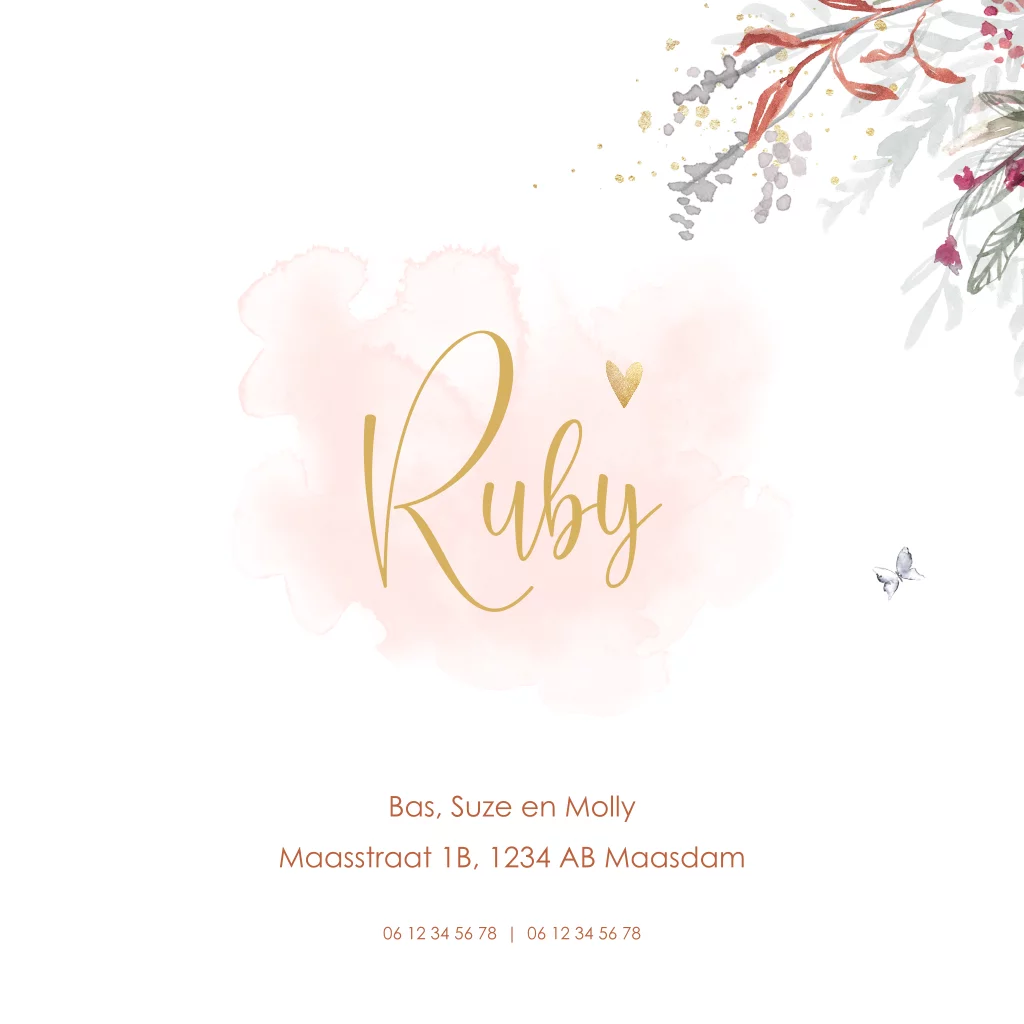 Een schattig geboortekaartje voor jullie meisje met een doorkijkje van een bloem en bloemenprint. Een vrolijke kaart met kleurrijk design.