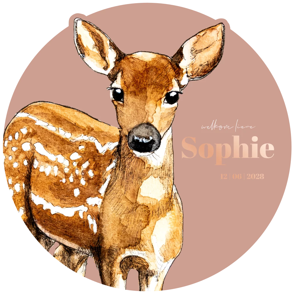 Kondig de geboorte van je dochter aan met dit kaartje! Het kaartje heeft een illustratie van een hertje. De combinatie van de roze achtergrond met de roségoudfolie elementen is prachtig. Het kaartje kan helemaal naar wens aangepast worden in onze online editor.