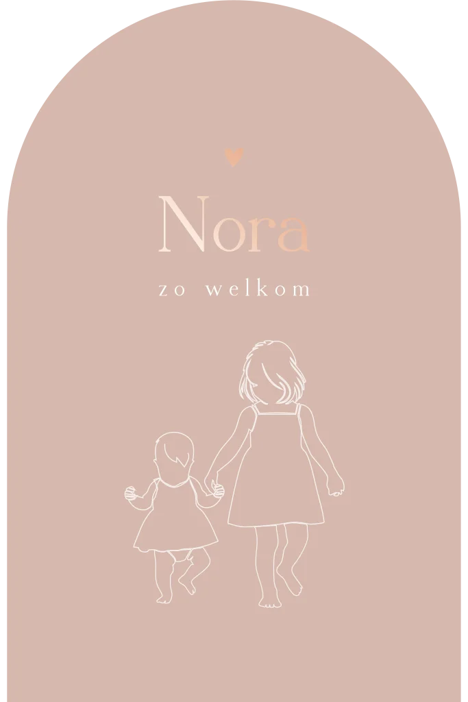 Een lief en romantisch geboortekaartje voor een zusje! Het kaartje heeft een originele arch vorm met roze achtergrond. Op het kaartje zie je een lijntekening van twee zusjes hand in hand. De naam wordt gedrukt in roségoudfolie. Pas het ontwerp naar wens zelf aan in de online editor.