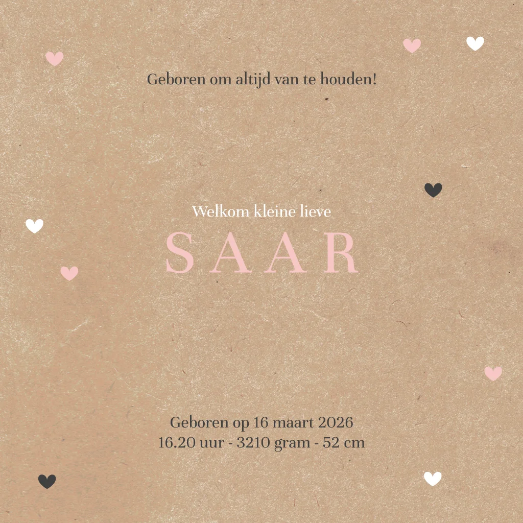 Stoer geboortekaartje met ronde uitsnede, hartjes en kraftlook