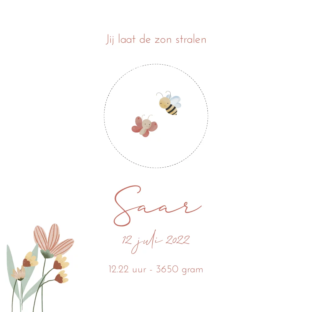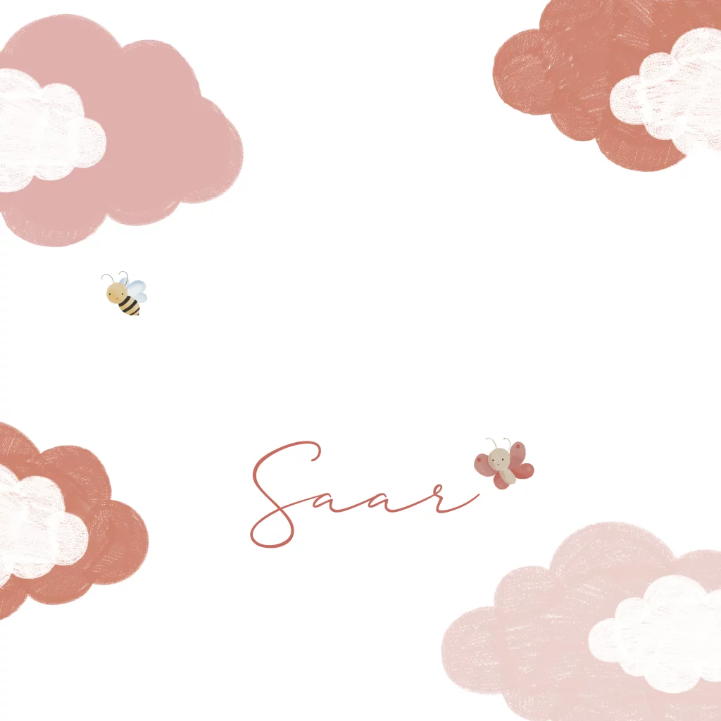 Lief en zacht geboortekaartje voor de geboorte van jullie dochtertje. Het kaartje heeft lieve wolkjes in roze & terra tinten met daar omheen vlinders en bijtjes die het kaartje een schattige uitstraling geven. Het is een origineel geboortekaartje door het doorkijkje. Je kan via het uitgesneden rondje door het kaartje heen kijken. Pas het ontwerp gemakkelijk in onze online editor aan.