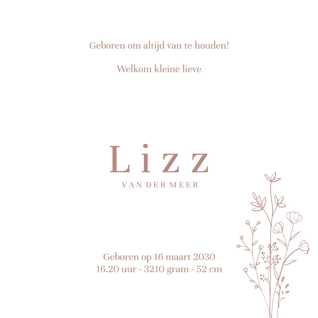 Dit is een lief geboortekaartje voor jullie dochter. Op de rode achtergrond staan lijntekeningen van bloemen en illustraties van kleine hartjes. De uitsnede van het hart geeft een doorkijkje naar de binnenkant van de kaart. Hier worden de naam en geboortedatum van jullie kleintje gedrukt. Pas het kaartje naar wens aan in onze online editor en bestel snel een proefdruk om dit kaartje in het echt te zien!