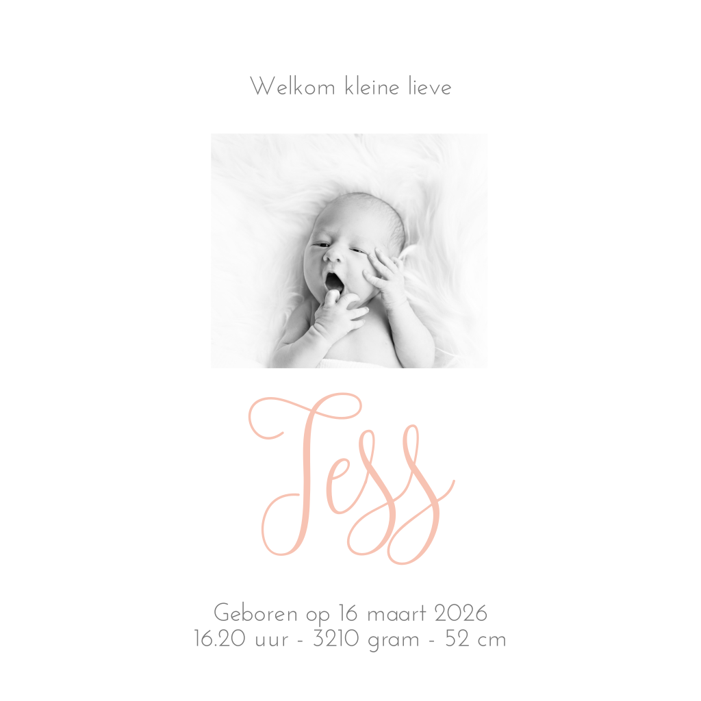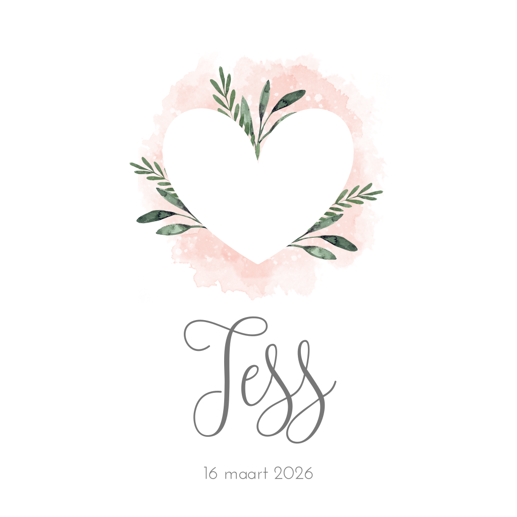 Dit is een lief geboortekaartje voor jullie pasgeboren dochter. De uitsnede van een hartje geeft een doorkijkje naar de foto van jullie dochtertje. De roze watercolour en kleine groene takjes maken dit kaartje helemaal compleet! Pas het kaartje naar wens aan in onze online editor en bestel snel een proefdruk om dit kaartje in het echt te zien!