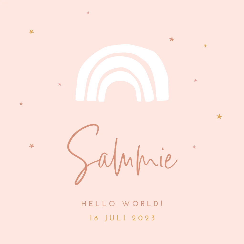 Uniek stans geboortekaartje voor je pasgeboren dochtertje met een uitsnede in de vorm van een hip regenboogje.