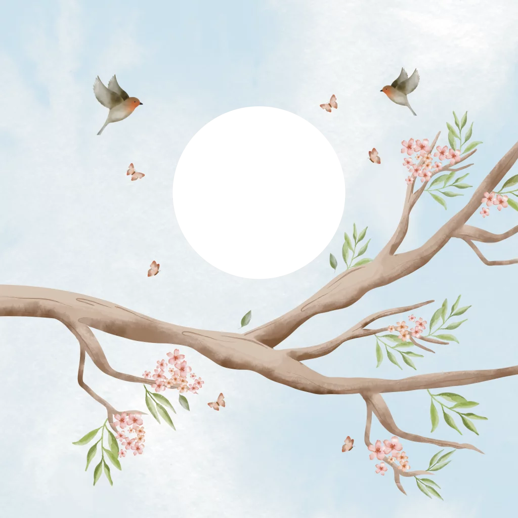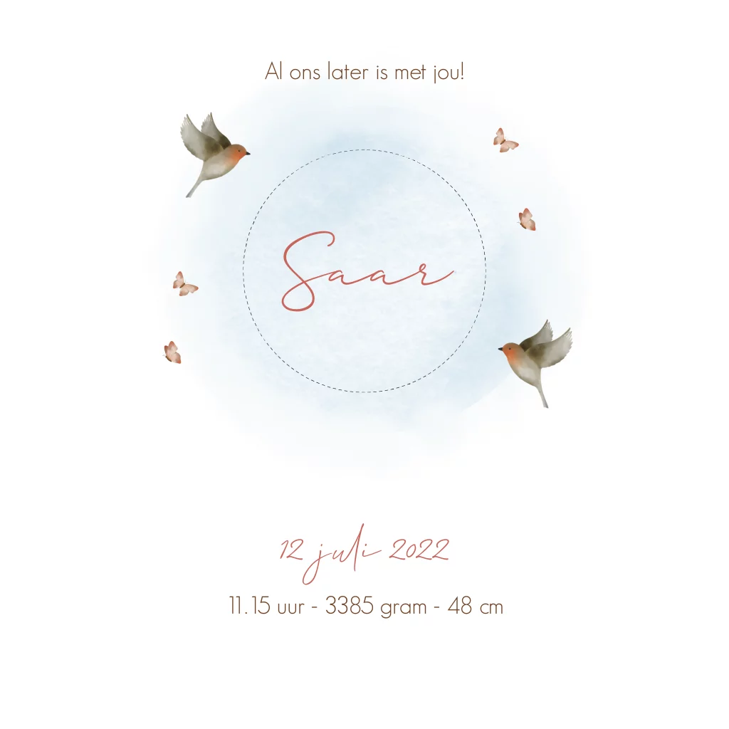 Romantisch en lief geboortekaartje voor de geboorte van jullie dochtertje. Het kaartje heeft een prachtige tekening van een bloesemtak met daar omheen schattige vogeltjes en vlinders die het kaartje helemaal compleet maken.