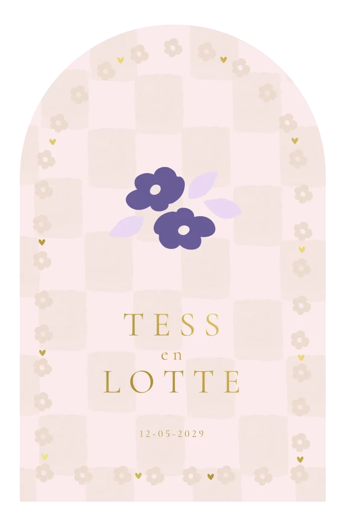 Een trendy geboortekaartje voor jullie meisjestweeling! Het kaartje heeft een boogvorm met daarop een roze ruitjespatroon. In het midden twee bloemen en langs de rand zie je een bloemetjespatroon. De naam wordt gedrukt in goudfolie. Pas het ontwerp naar wens aan in onze online editor.