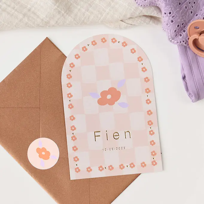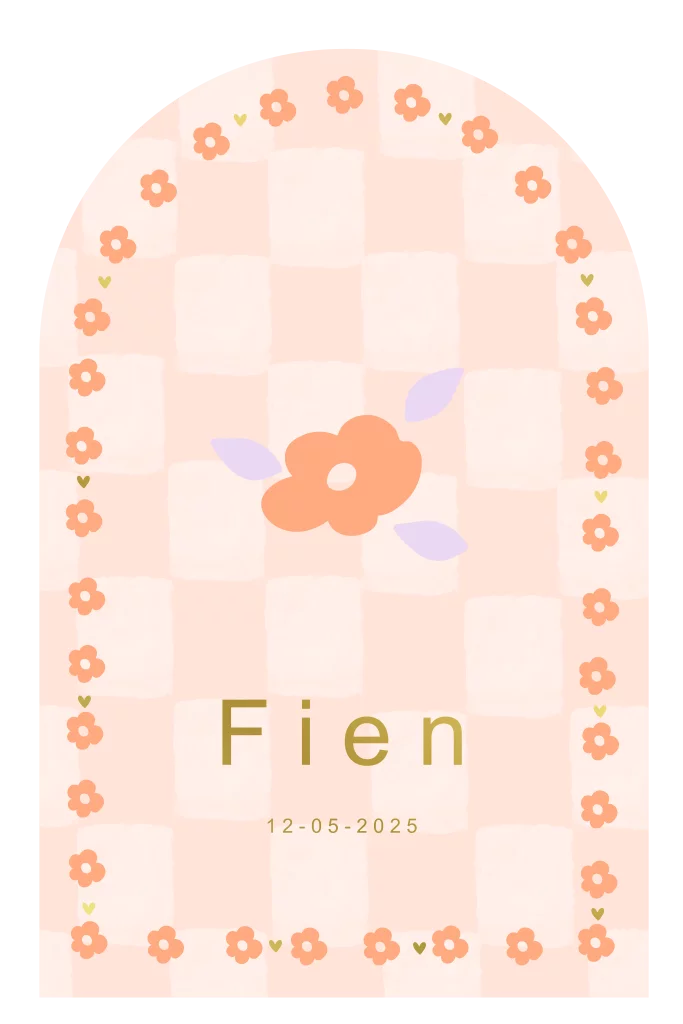 Een trendy geboortekaartje voor jouw kindje! Het kaartje heeft een arch boog vorm met daarop een oranje ruitjespatroon. In het midden en langs de rand zie je een bloemetjes patroon. De naam wordt gedrukt in goudfolie. Pas het ontwerp naar wens aan in onze online editor.