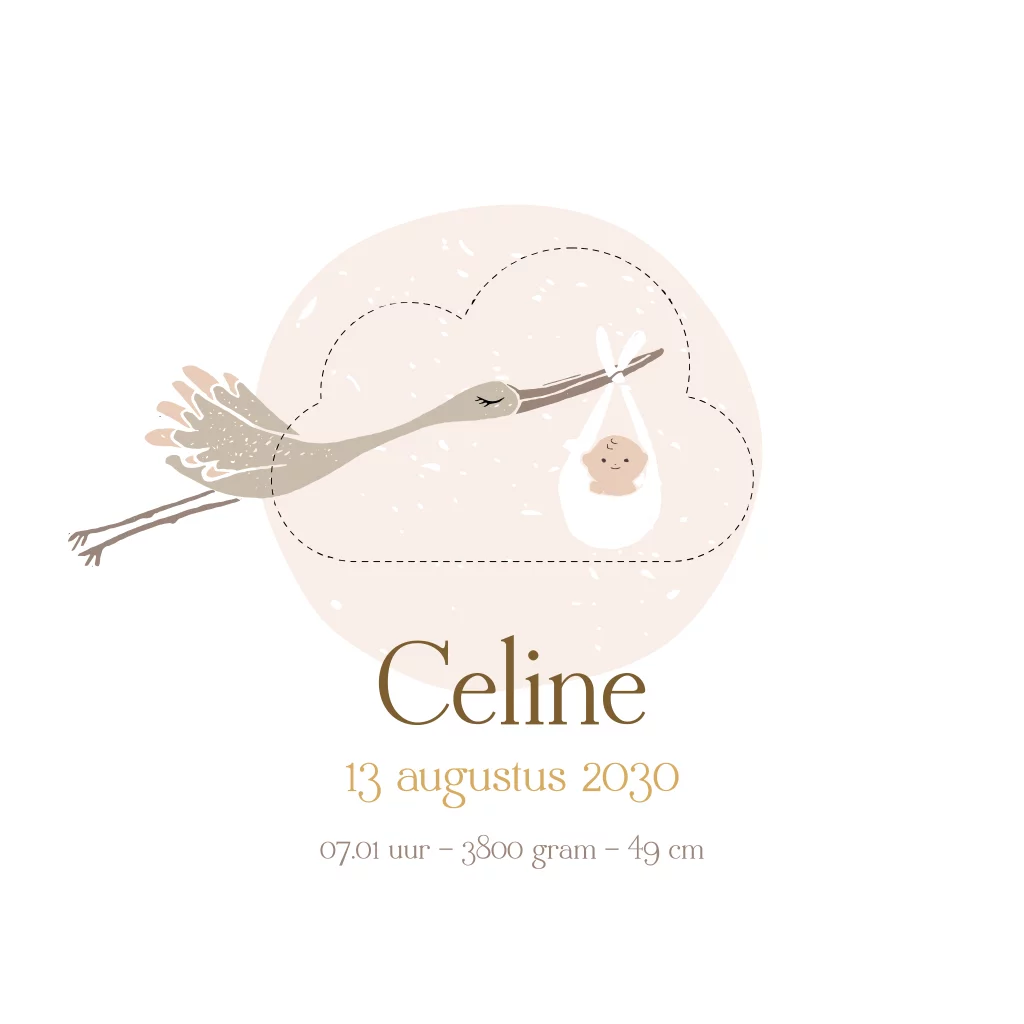 Een lief geboortekaartje in naturel tinten voor jouw kindje. Het kaartje heeft een schattig doorkijkje in de vorm van een wolkje. Daardoor heen zie je een ooievaar. Het kaartje is verrijkt met goudfolie details.