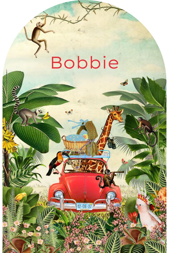 Een origineel geboortekaartje in een arch vorm. Het kaartje heeft een vrolijke jungle thema. Je ziet illustaties van verschillende dieren en een auto midden in de jungle. Op de auto staat het wiegje van jullie kleintje. In onze online editor kan je het kaartje naar wens aanpassen.