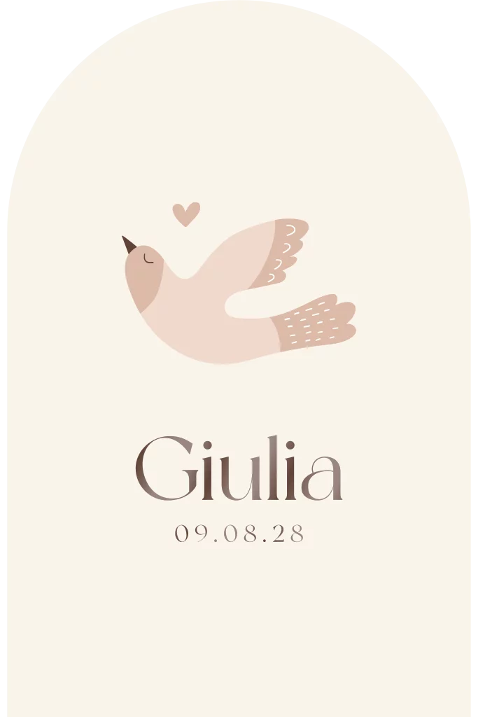 Een lief en stijlvol geboortekaartje in een arch vorm. Het kaartje heeft een illustratie van een duifje met de naam in hoogglans gedrukt. Pas het kaartje naar wens aan in onze online editor en bestel een proefdruk om dit kaartje in het echt te zien!